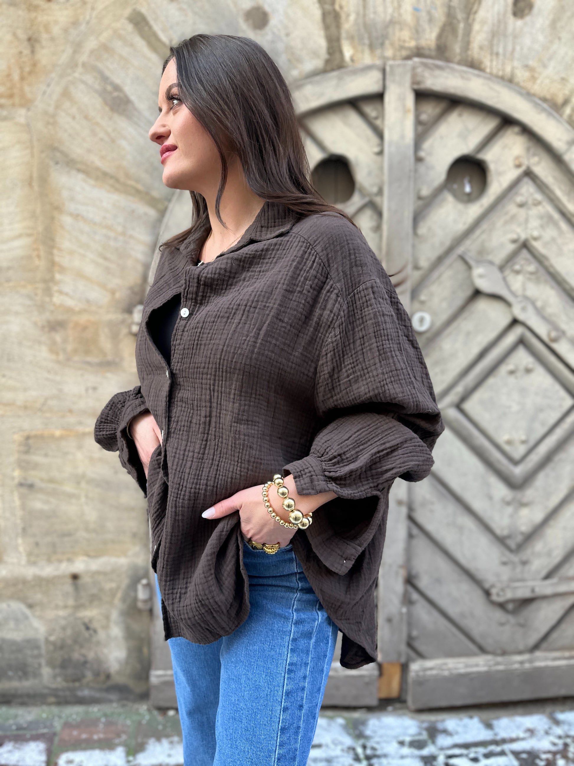 Unsere wunderschöne Musselinbluse hat die perfekte Länge und kommt gleich in drei Farben: Bubblegum, Ocean und Brownie 🥰